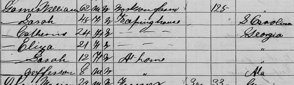 | Last known record: | 1870 census Carroll County, Georgia (There's also an 1876 Carroll County tax digest that seems to include |