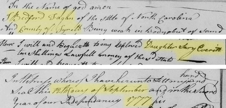 1: North Carolina Secretary of State, Original Wills 1663-1789, the will of Nathaniel Everitt dated 2 November 1749. FamilySearch, <https://www.familysearch.org/ark:/61903/3:1:3QSQ-G9GC-F8L4?i=436&cat=457752> et seq., accessed 19 September 2019. The will describes