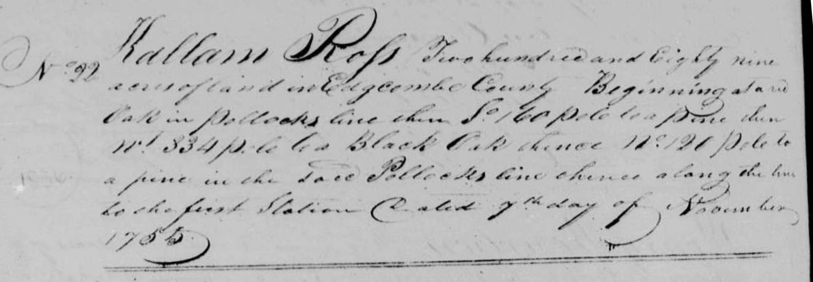 2: North Carolina state land patent, Edgecombe book 11, page 254, grant #22, file #1536, issued 7 November 1755 to Kallam Ross for 289 acres beginning at a red oak in Pollocks line. North Carolina MARS ID 12.14.59.1545. <http://www.nclandgrants.com/grant/?mars=12.14.59.1545&qid=561035&rn=8>, accessed 20 June 2020. You can see a copy here.