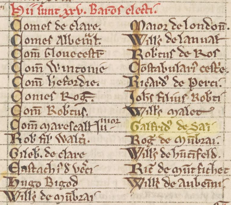 The barons' names aren't specified in the Magna Carta itself, nor is there an extant primary record of such, but four early sources attest their names. One of these is copied below.