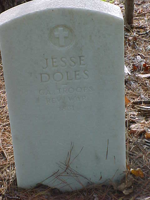 16: The tombstone of Jesse Doles (1751-1831), Doles family cemetery, Baldwin County, Georgia, coordinates N33.12056 W83.34944. Photograph submitted by Jack Johnson to FindAGrave.com (<https://www.findagrave.com/memorial/13629799/jesse-doles>) on 16 March 2006.