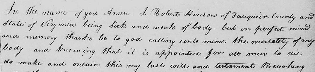 11: Fauquier County, Virginia. Tax digest for 1790, page 11, entry for Robert Hinson. FamilySearch, <https://www.familysearch.org/ark:/61903/3:1:3Q9M-CSQ2-Q3BH-F?i=338&cat=775969>, accessed 7 September 2021.