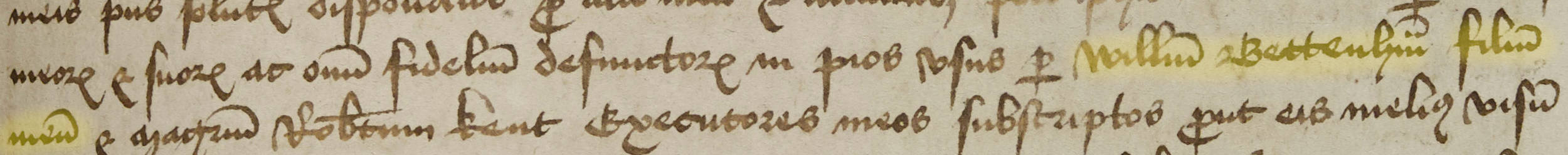 3: Kent History and Library Centre archive reference CCA-DCb/PRC/32/3/361 (Canterbury Cathedral Archives / Diocese of Canterbury / Probate Court Records / Consistory Court Registers of Wills / Registers of Wills, 1484-1493), the will of William Betynham of Cranbroke, dated 13 January Henry VII 8. FamilySearch (FHL microfilm 188834, images 395 and 396 of 410). FamilySearch restricts access to these images, so see copies here: 395, 396. For the small excerpt illustrated above, I used a color copy of the will, which I obtained privately.