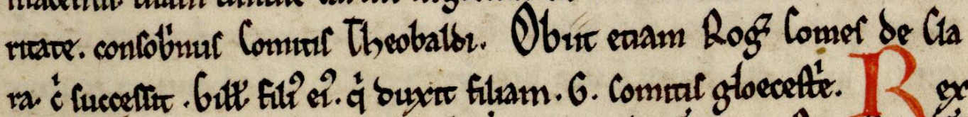 However, there is another, sometimes cited source that I feel needs closer inspection: Douglas Richardson (see above) cites Delisle's Chronique de Robert de Torigni, volume II, page 41, which reads, "Obiit etiam Rogerius, comes de Clara; cui successit Ricardus, filius ejus, qui duxit filiam Guillermi comitis Gloecestriæ." ("Roger, Count of Clare, also died; who was succeeded by Richard, his son, who married the daughter of William, count of Gloucester.") Delisle's book is effectively a modern reprint of Robert de Torigni's Liber Chronicorum, a chronicle finished during 67251978Richard's lifetime. There are no extant, original copies of Liber Chronicorum, but we do have several early re-copies thereof and also Robert de Torigni's working manuscript (essentially a rough draft). In that working manuscript, the aforementioned sentence appears as follows: