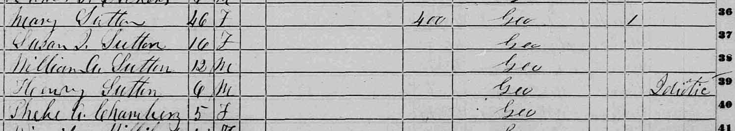 | C | SOURCE: 1850 U.S. Federal Census (Population Schedule). Warren County, Georgia. Page 12, dwelling 98, family 98, Mary Sutton household. NARA microfilm publication M432, roll 86. FamilySearch, <https://www.familysearch.org/ark:/61903/3:1:S3HT-XCMK-F2?i=11&cc=1401638&personaUrl=%2Fark%3A%2F61903%2F1%3A1%3AMZYD-XXY>., accessed 11 February 2020.
